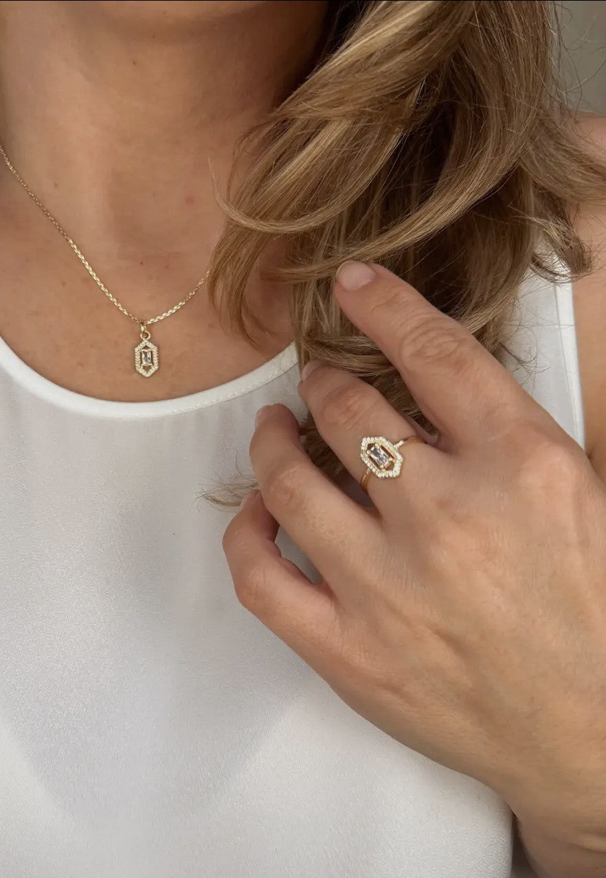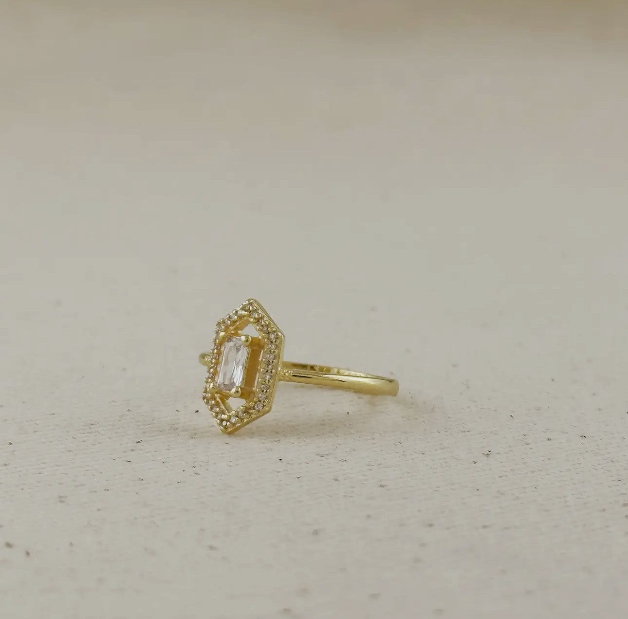 Make a sophisticated statement with our stunning baguette ring. The sleek, elongated stone creates a modern yet timeless look that catches the light beautifully. Its slim profile and elegant design make it the perfect standout piece. Each ring features a precisely cut baguette CZ Stone surrounded by micro CZ Stones that adds a touch of understated glamour to any outfit, from casual daywear to evening elegance. The clean lines and classic design make this ring a versatile addition to your jewelry collection.