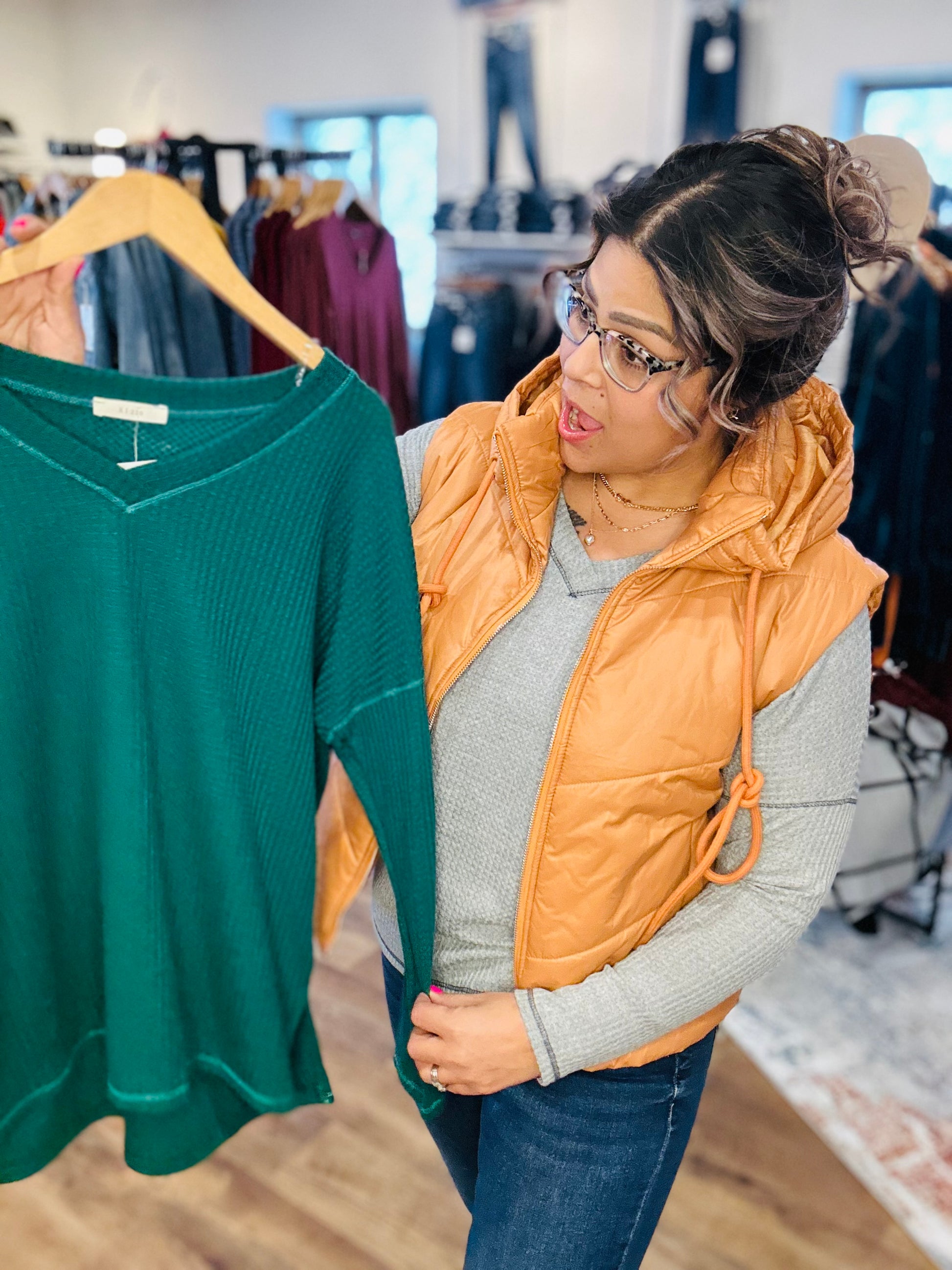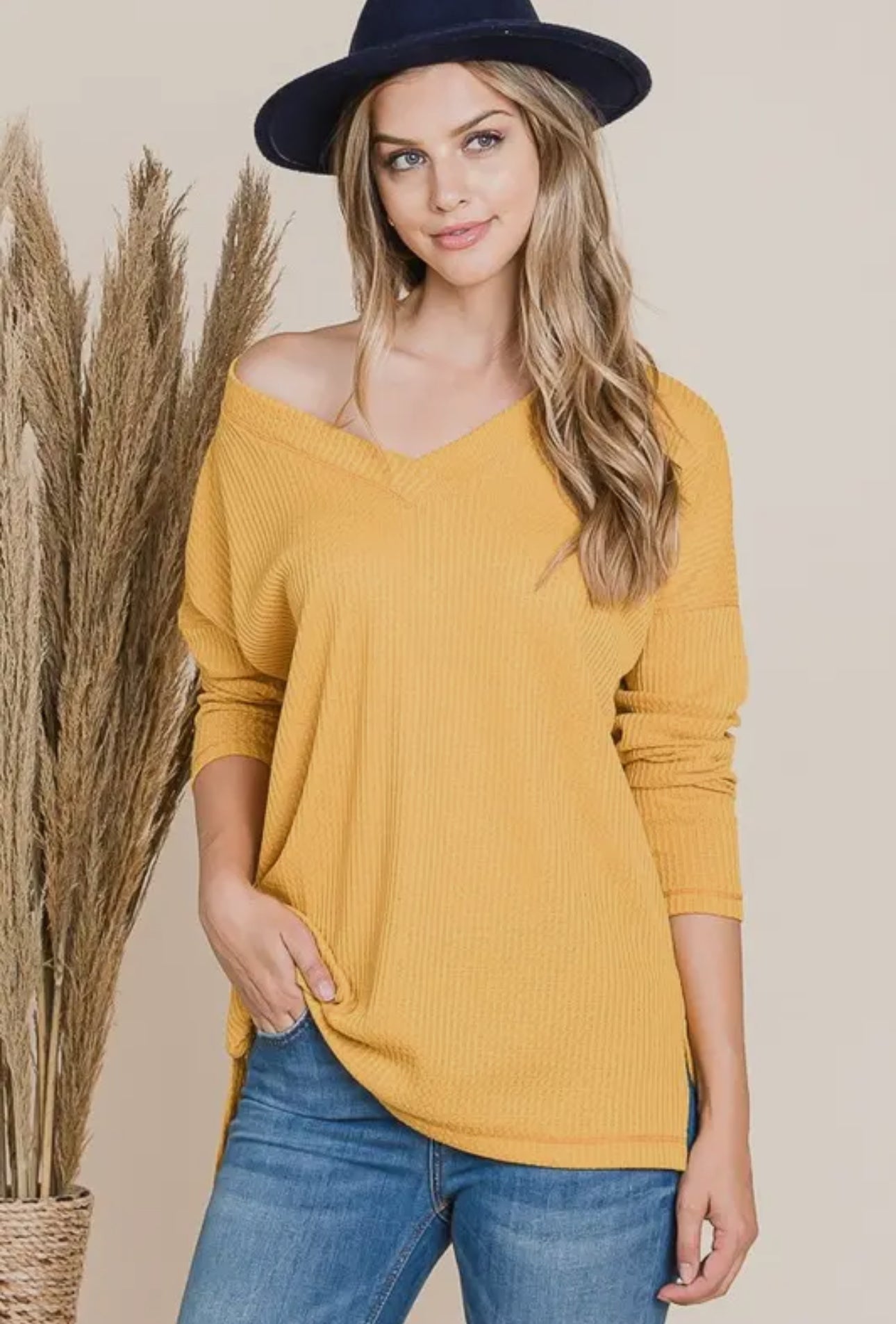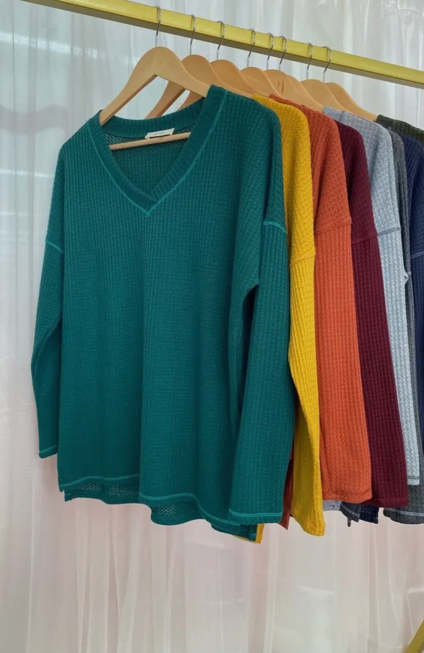 The Belinda Knit is a cozy v-neck shirt with a playful drop shoulder design.
