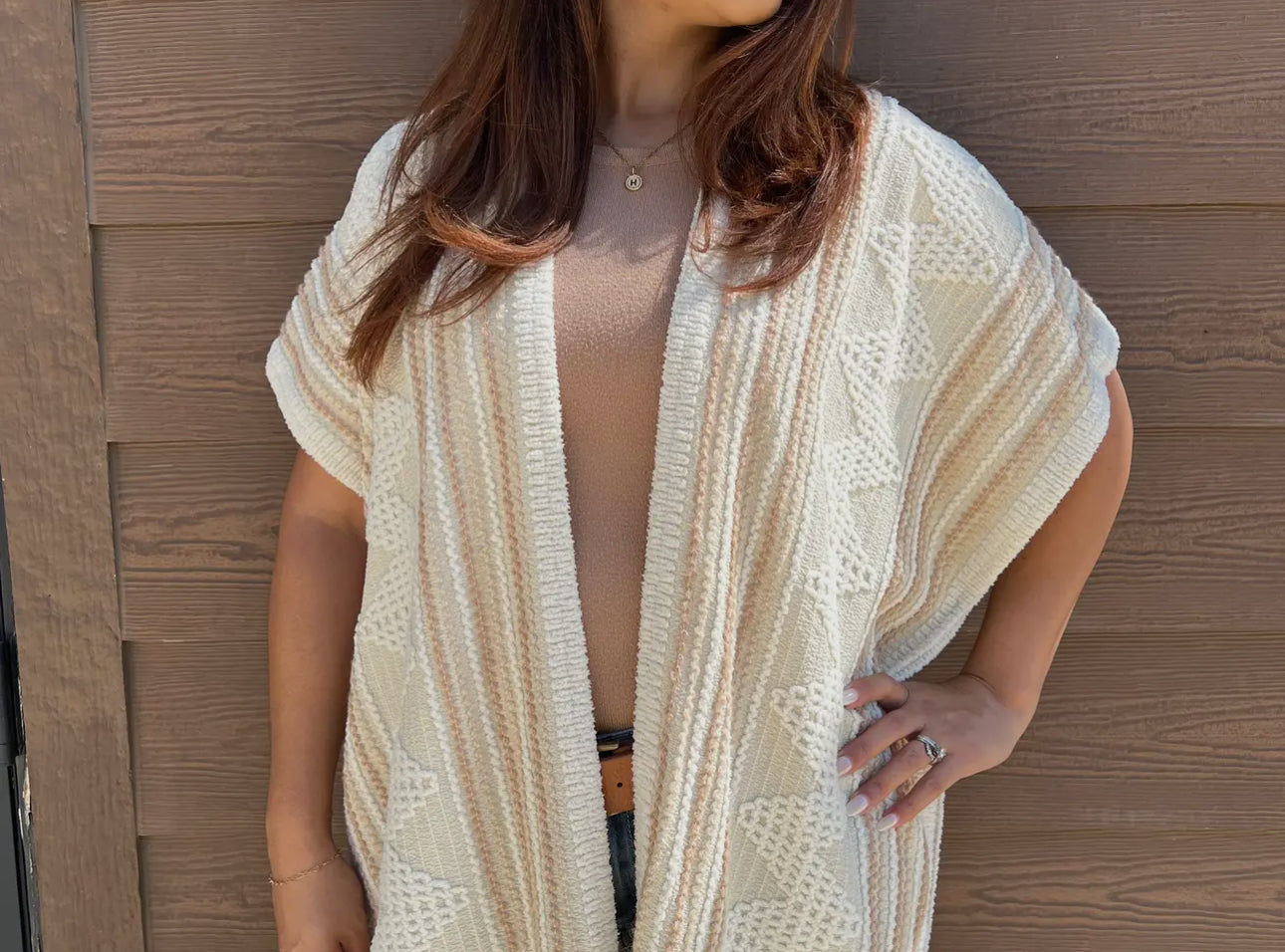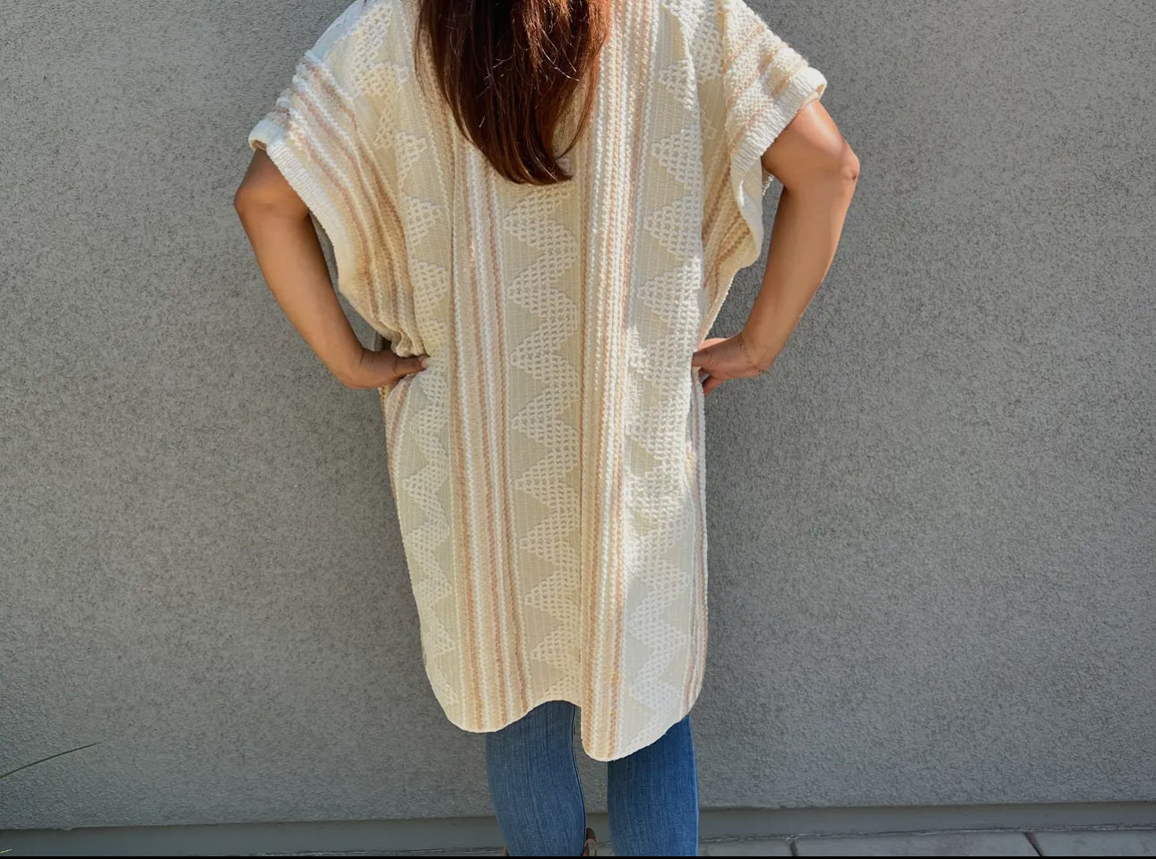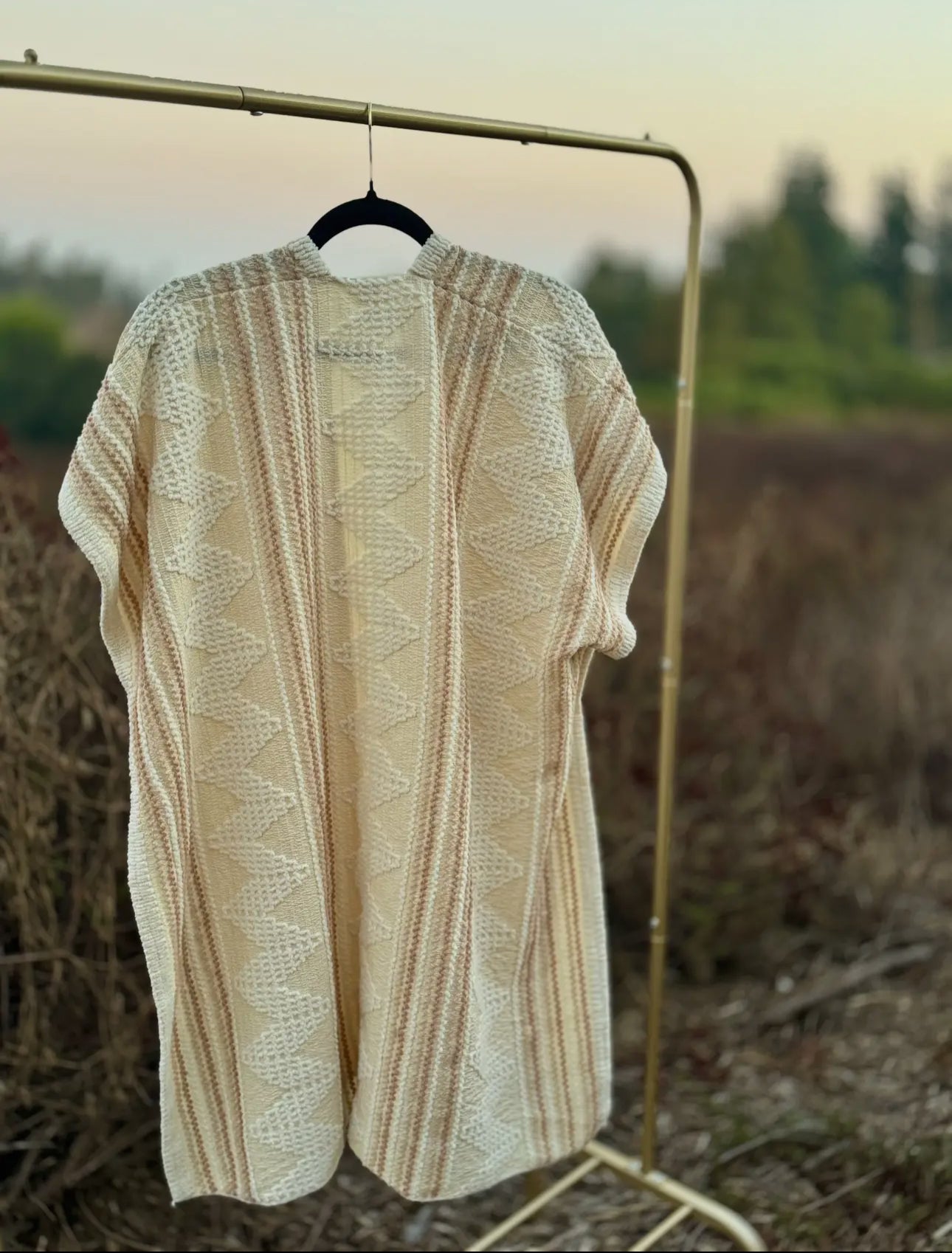 Our open-front Corn Maze kimono features a cream-colored base with subtle beige zigzag and stripe patterns throughout. This lightweight kimono is perfect for layering and offers a relaxed fit that drapes beautifully over the body. The fabric appears textured, adding depth and a cozy feel to the garment. With short sleeves and falling around mid-thigh, this kimono is versatile enough to pair with jeans, shorts, or dresses. It's ideal for casual wear, bringing a touch of boho-chic elegance to any outfit.