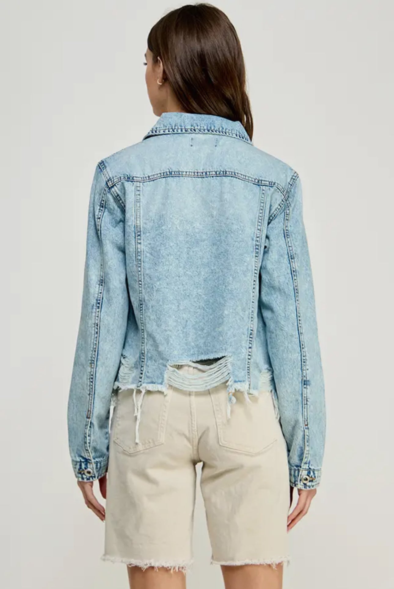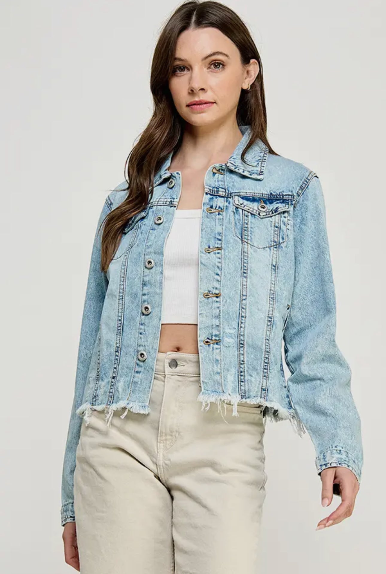 The Deidra Denim Jacket: Your new go-to for comfort and style. This jacket features a distressed hem and authentic sleeve button closure, with button-flap chest pockets. Made from 100% cotton. Available in regular and plus sizes.
