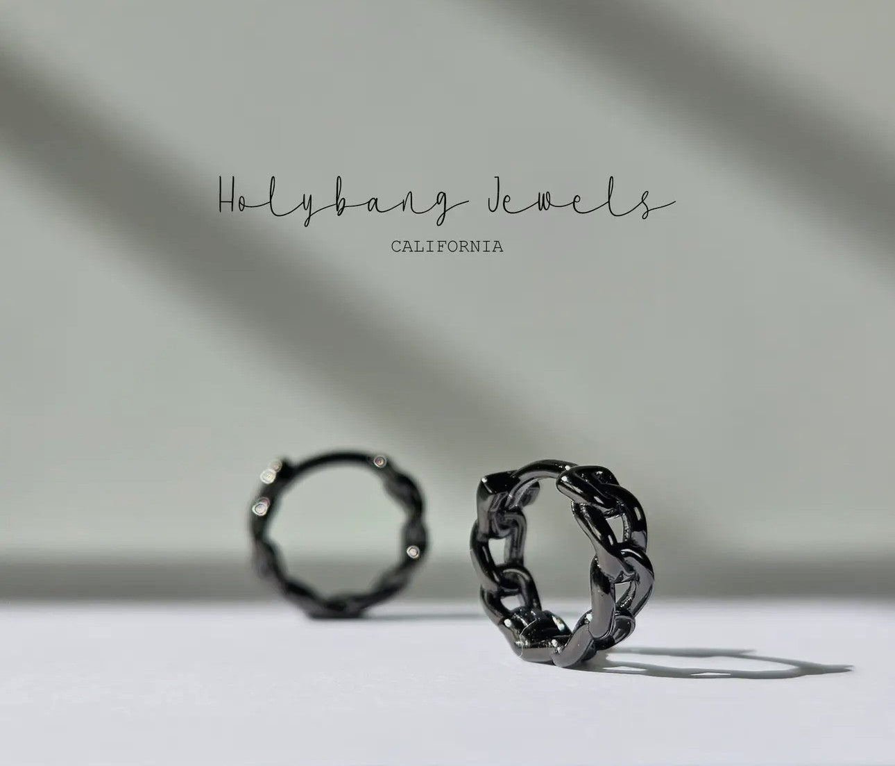 Available in a variety of colors, these Chain Huggie Hoops have an 8mm inner diameter and are plated with gold, rhodium, or black rhodium on top of 925 sterling silver for a thick, nickel-free, hypoallergenic finish. Sold as a pair, the inner diameter measures 8mm while the outer diameter is 9mm/11mm and the width is 2.8mm.