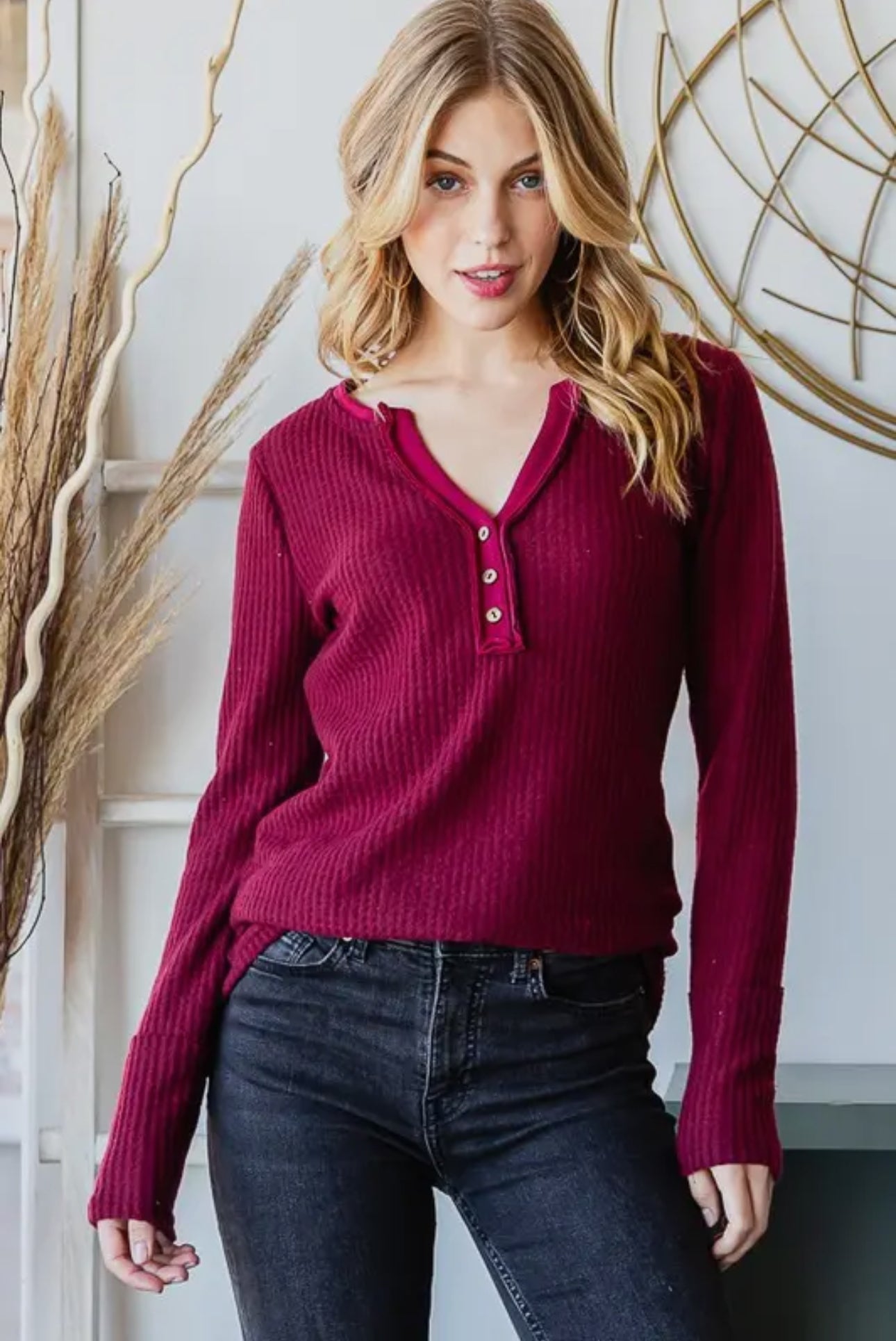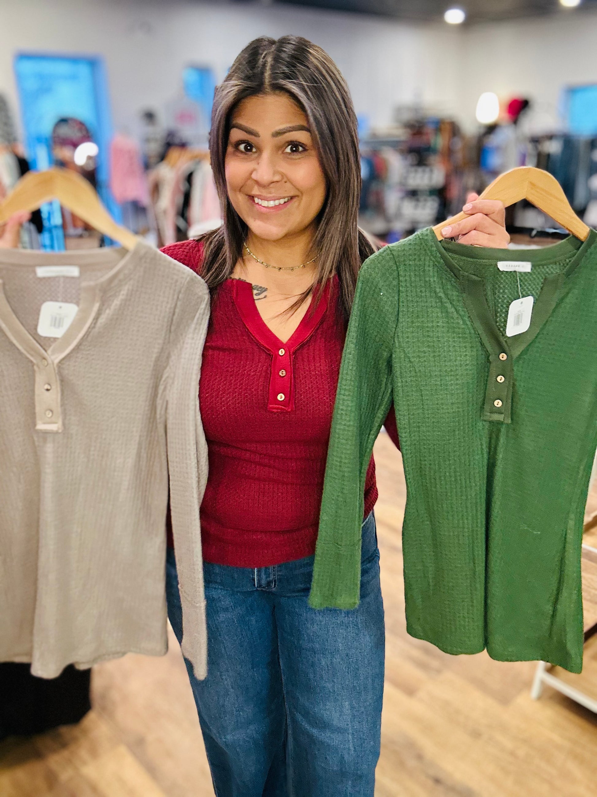 Hope Henley is available in three elegant colors: mocha, olive, and wine. It features a V-neck design with intricate button down details and is crafted from a cozy waffle knit material.