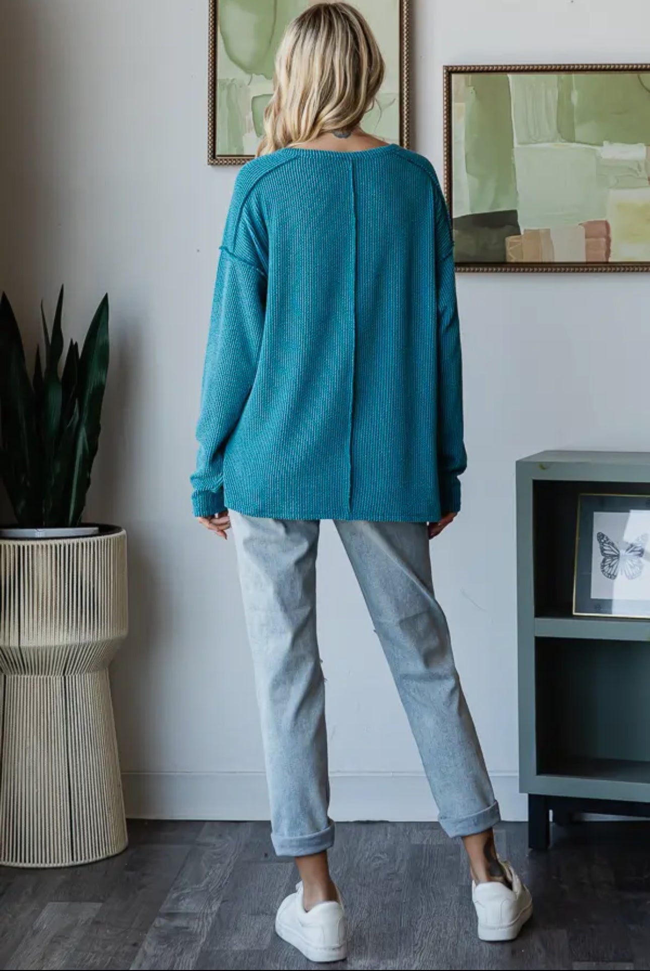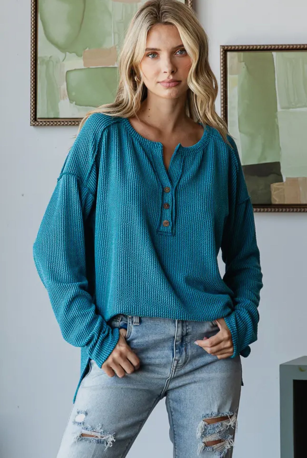 Get ready to stand out with the Jeanie Henley, a top that boasts a unique high-low design, a button-up front, a classic V-neck, trendy drop shoulders, exposed stitching, stylish bishop sleeves, and a comfortable relaxed fit.