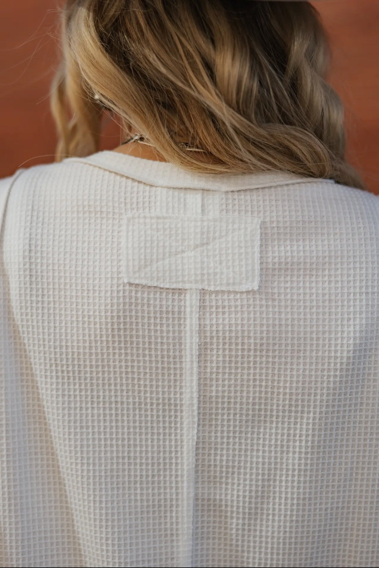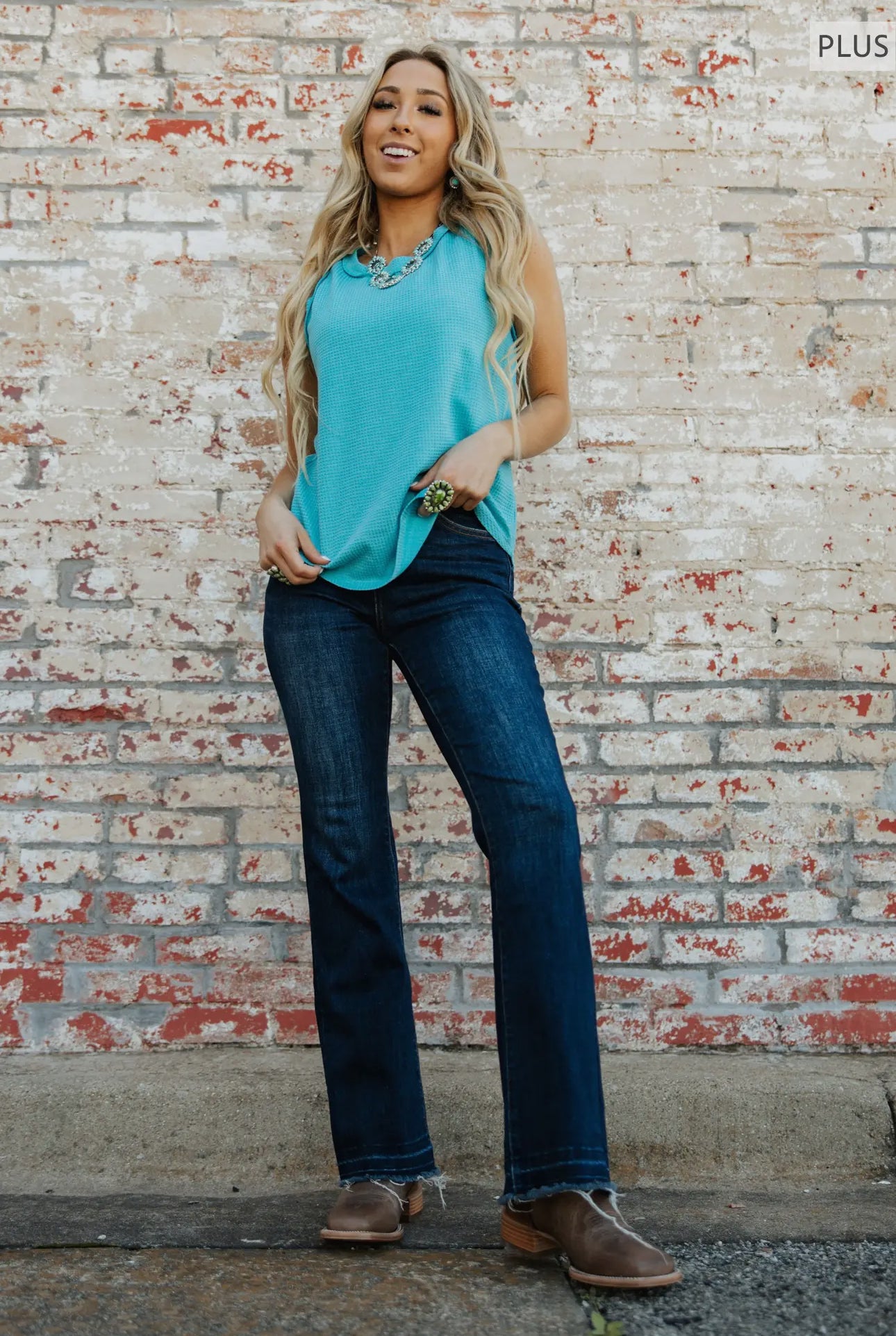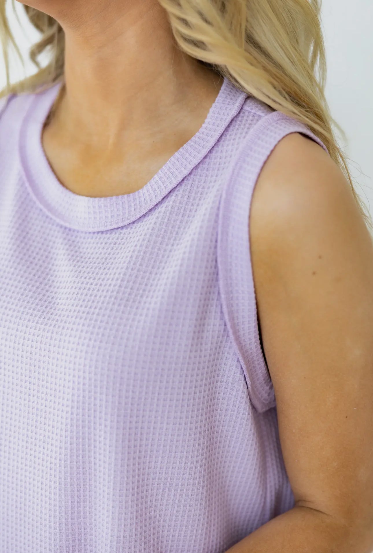 The Tina Tank features a waffle knit design and a round neck, with a unique patch detail on the back. Available in a variety of vibrant colors perfect for the summer season.